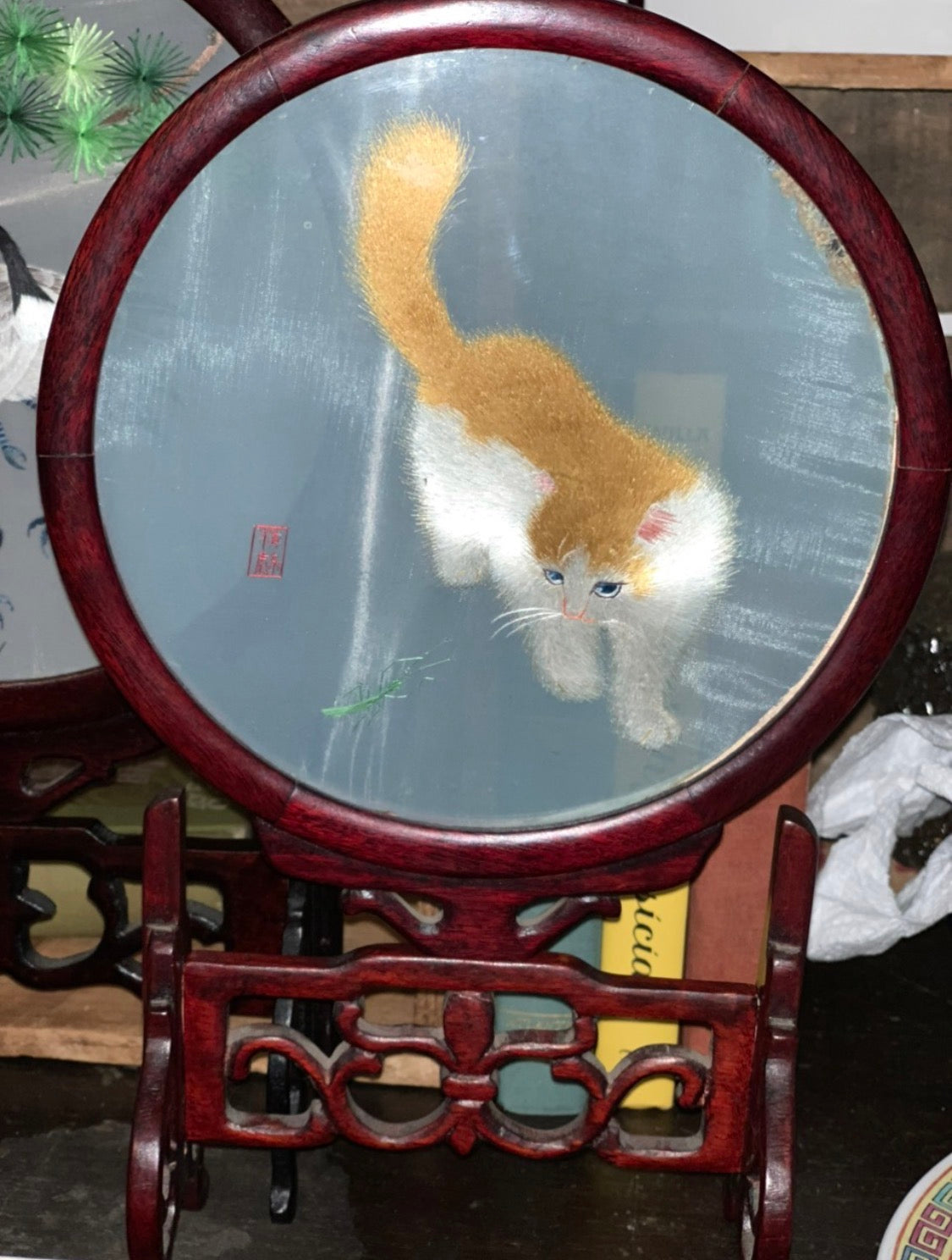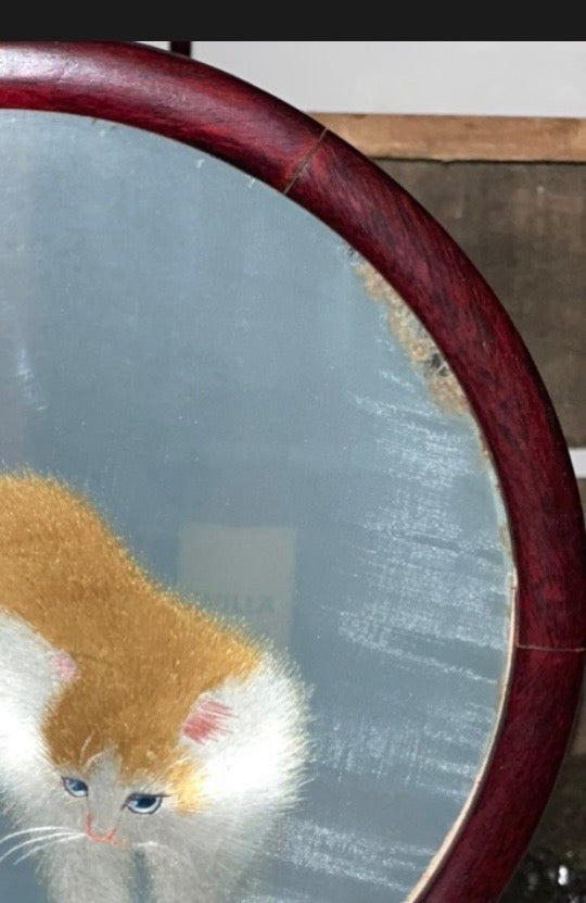 Vintage Item disclaimers SEE ALL PHOTOS prior to purchasing. The Cat has a disclaimer up in the top of the circle frame, shown in pictures. It looks to be glue on the screen.
